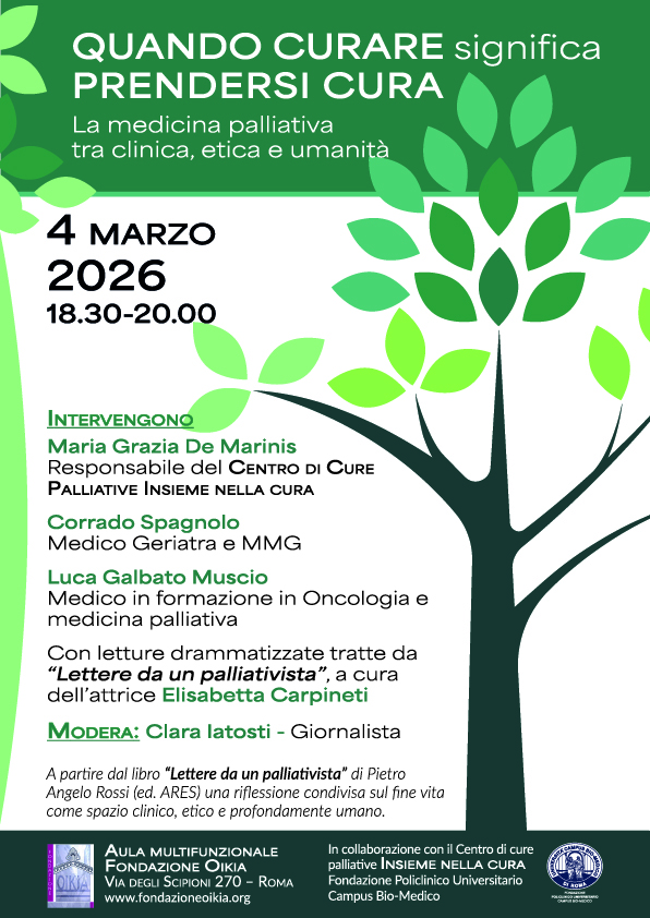 Che cosa significa davvero curare quando la guarigione non è più possibile? È intorno a questa domanda essenziale che nasce l’incontro “Quando curare significa prendersi cura. La medicina palliativa tra clinica, etica e umanità”, in programma mercoledì 4 marzo, dalle 18:30 alle 20:00, a Roma presso la sede della Fondazione Oikia, Via degli Scipioni n. 270.